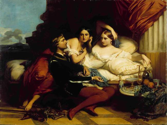 Por lo que, levantándose todas e invitado él, le condujeron a un fresco patio donde mandaron traer finísimos vinos y dulces; y al final, con palabras ingeniosas y corteses le preguntaron cómo podía ser aquello de estar él enamorado de esta hermosa señora sabiendo que era amada de muchos hermosos, nobles y corteses jóvenes.